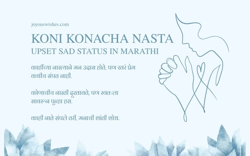 Hello friends! Welcome to Joyous Wishes – your trusted friend for expressing every emotion perfectly! 😊 We understand that sometimes life makes us feel upset and sad, and during those moments, we search for the right words to express our feelings. That’s exactly why we created this special collection of Koni Konacha Nasta Upset Sad Status in Marathi just for you! 💔 At Joyous Wishes, we believe that sharing your emotions is important for healing your heart. Whether you’re feeling lonely, hurt, or disappointed because someone isn’t there for you, our Koni Konacha Nasta Upset Sad Status in Marathi will help you express exactly what’s in your heart.