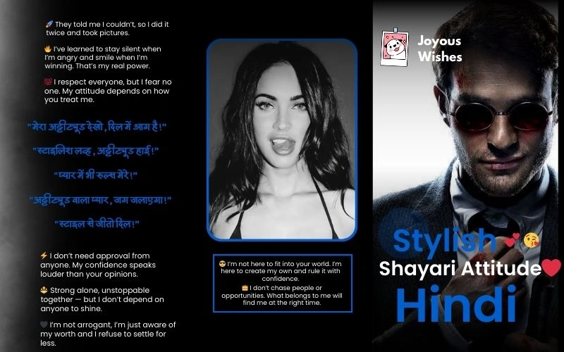 Our Attitude Shayari😎😎😎 collection is specially designed for those who love to express themselves with confidence and style. You’ll also find beautiful Shayari Attitude lines in Hindi that are perfect for your daily posts and status updates. We believe that words have power, and the right Stylish 💕 😘 Shayari Attitude❤ Hindi can make your message more impactful and memorable. At Joyous Wishes, we’re not just sharing shayari – we’re helping you express your true self! 🎭💖 So get ready to fill your life with beautiful words and amazing expressions that everyone will love! 🌟